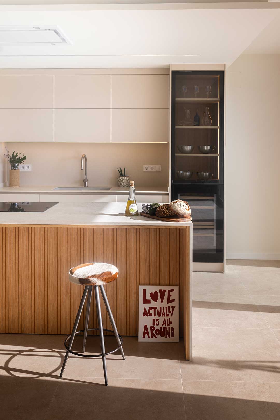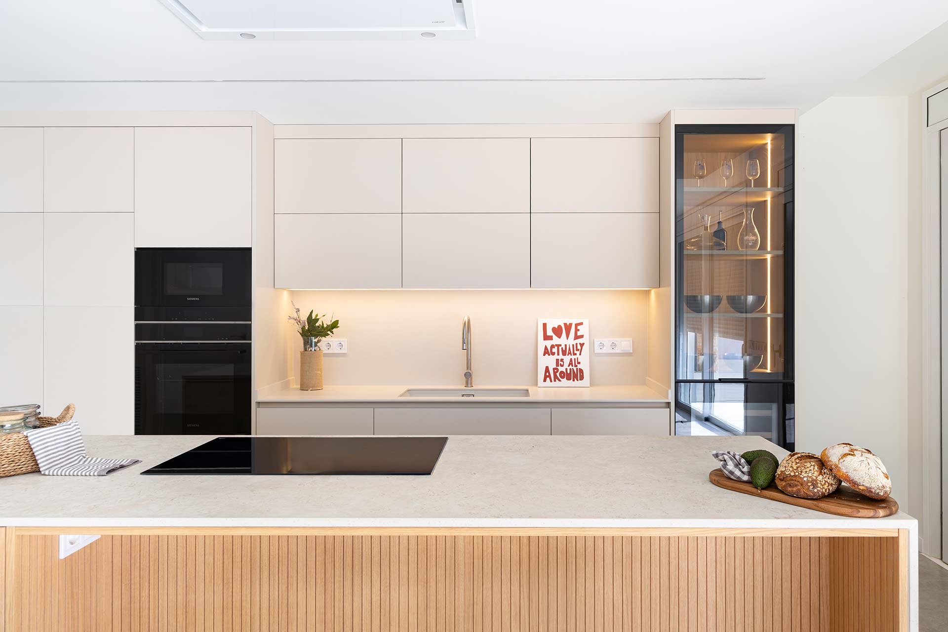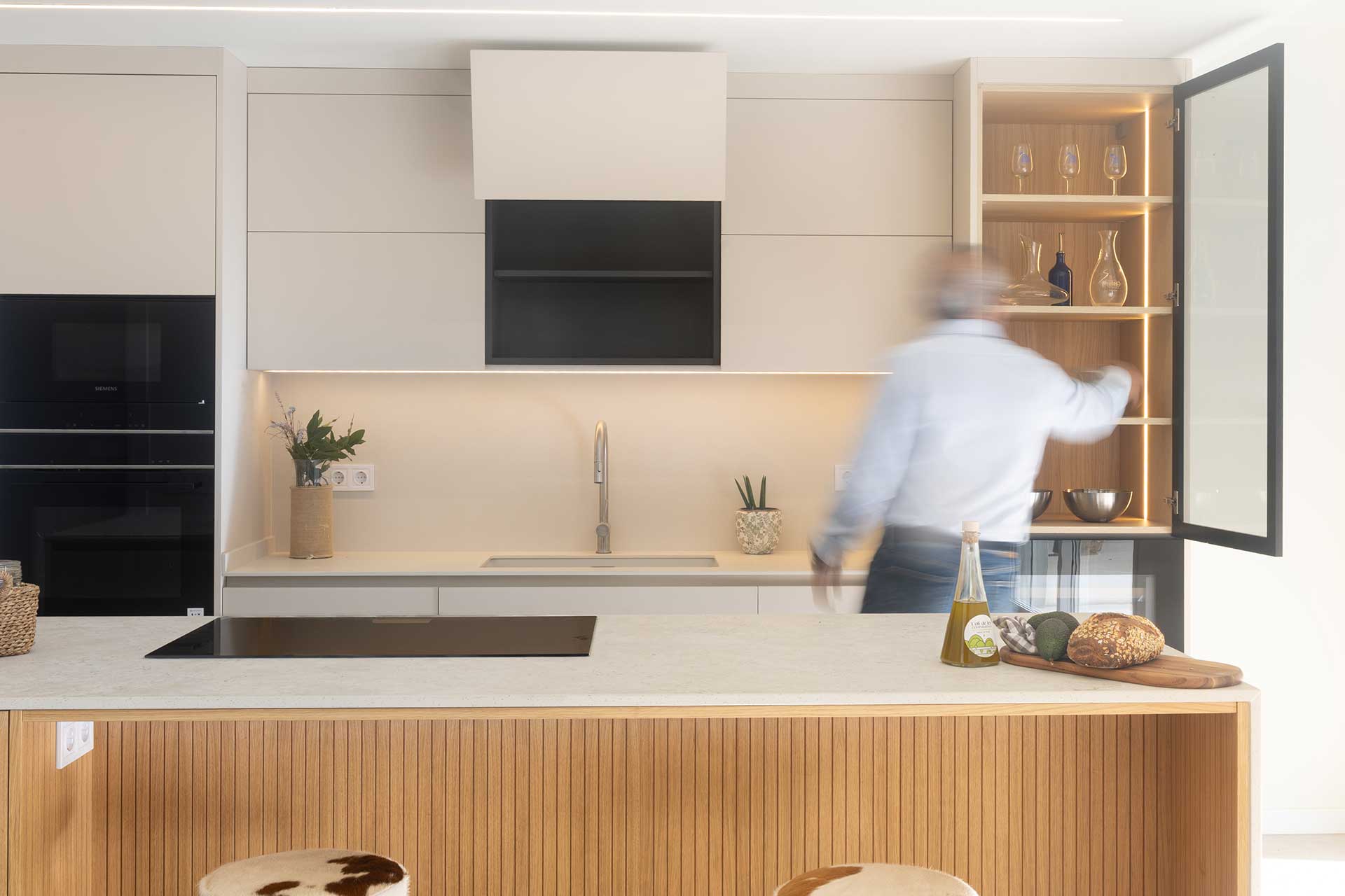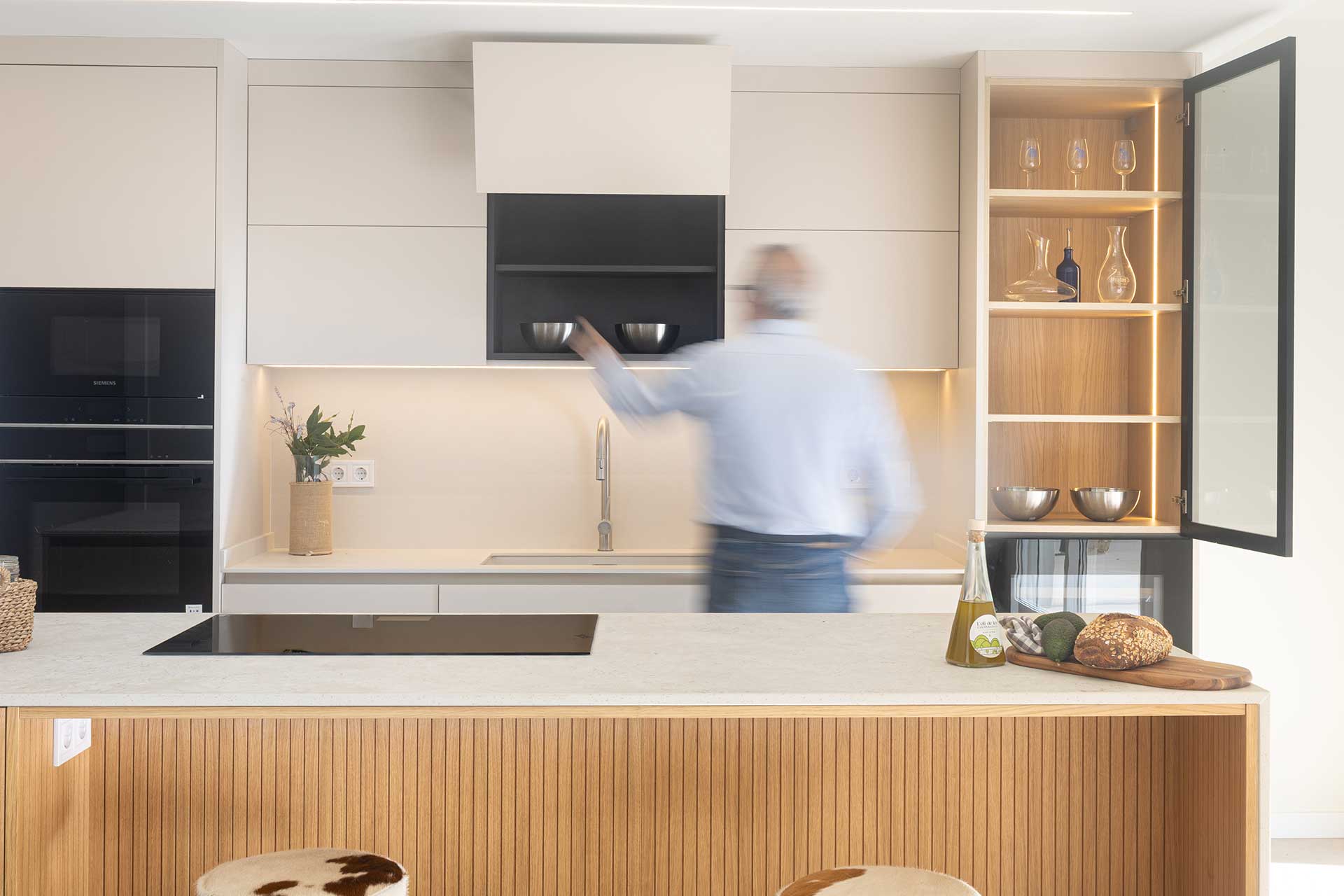 En este proyecto de cocina, el punto de partida fue un objetivo claro: integrar una vitrina y una vinoteca como ejes compositivos, construyendo un diseño donde estética y funcionalidad avanzan en equilibrio. Las vitrinas, hoy convertidas en piezas arquitectónicas clave—especialmente en cocinas abiertas al salón—aportan ligereza, profundidad e iluminación, además de funcionar como espacio de exposición para vajillas y piezas especiales. Aquí, el interior en madera aporta calidez y contrasta con la perfilería negra, mientras la iluminación LED vertical refuerza una atmósfera elegante que dialoga con la vinoteca. La gran isla central actúa como corazón social del espacio, con Dekton Sabbia en cascada como elemento casi escultórico, equilibrado por Dekton Aeris en la zona de fregadero; y la madera alistonada de roble, en puertas y trasera de isla, refuerza la integración con la zona de estar. El resultado es una cocina serena, cálida y atemporal, donde la vitrina no solo almacena: define la identidad del conjunto con luz, orden y carácter.