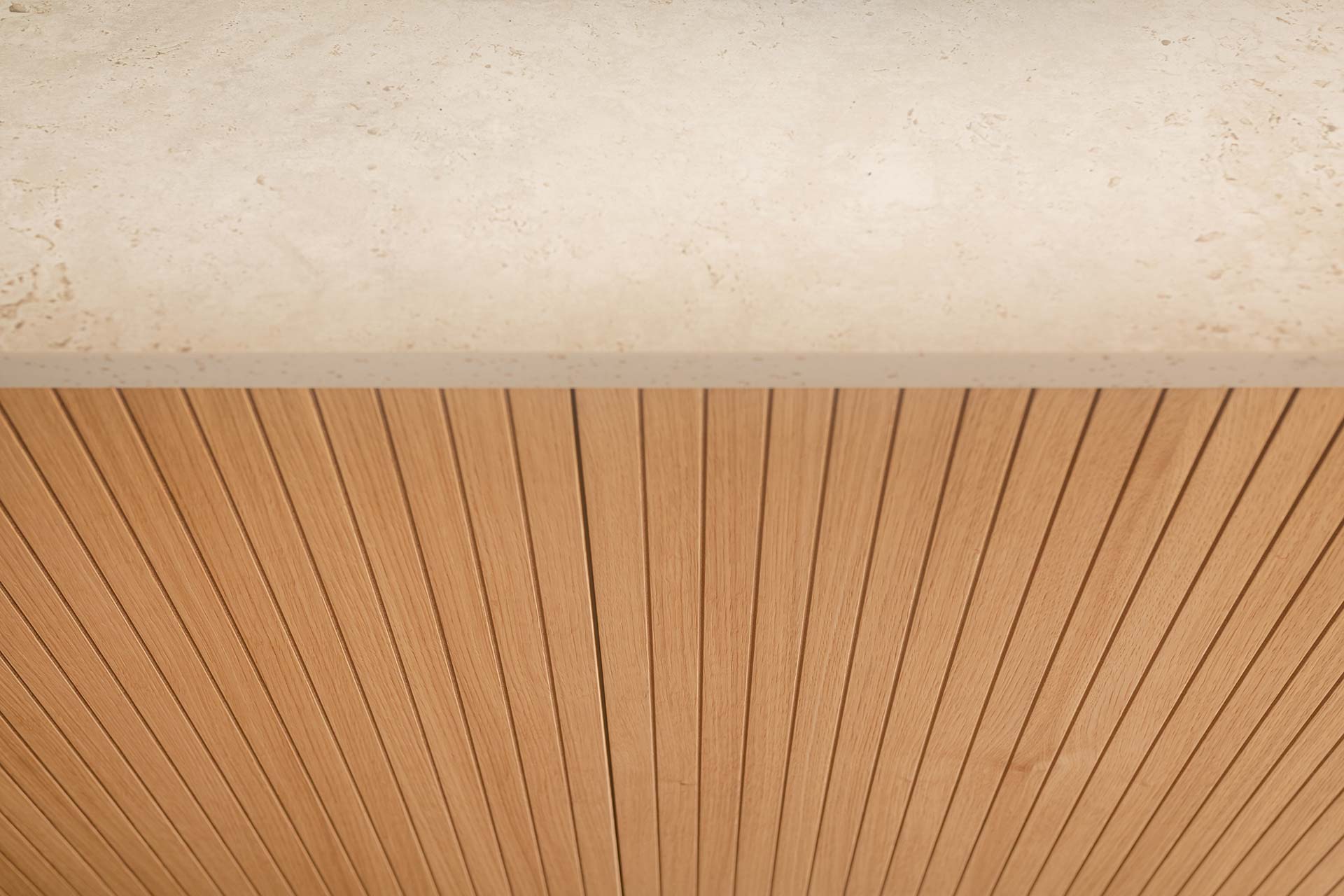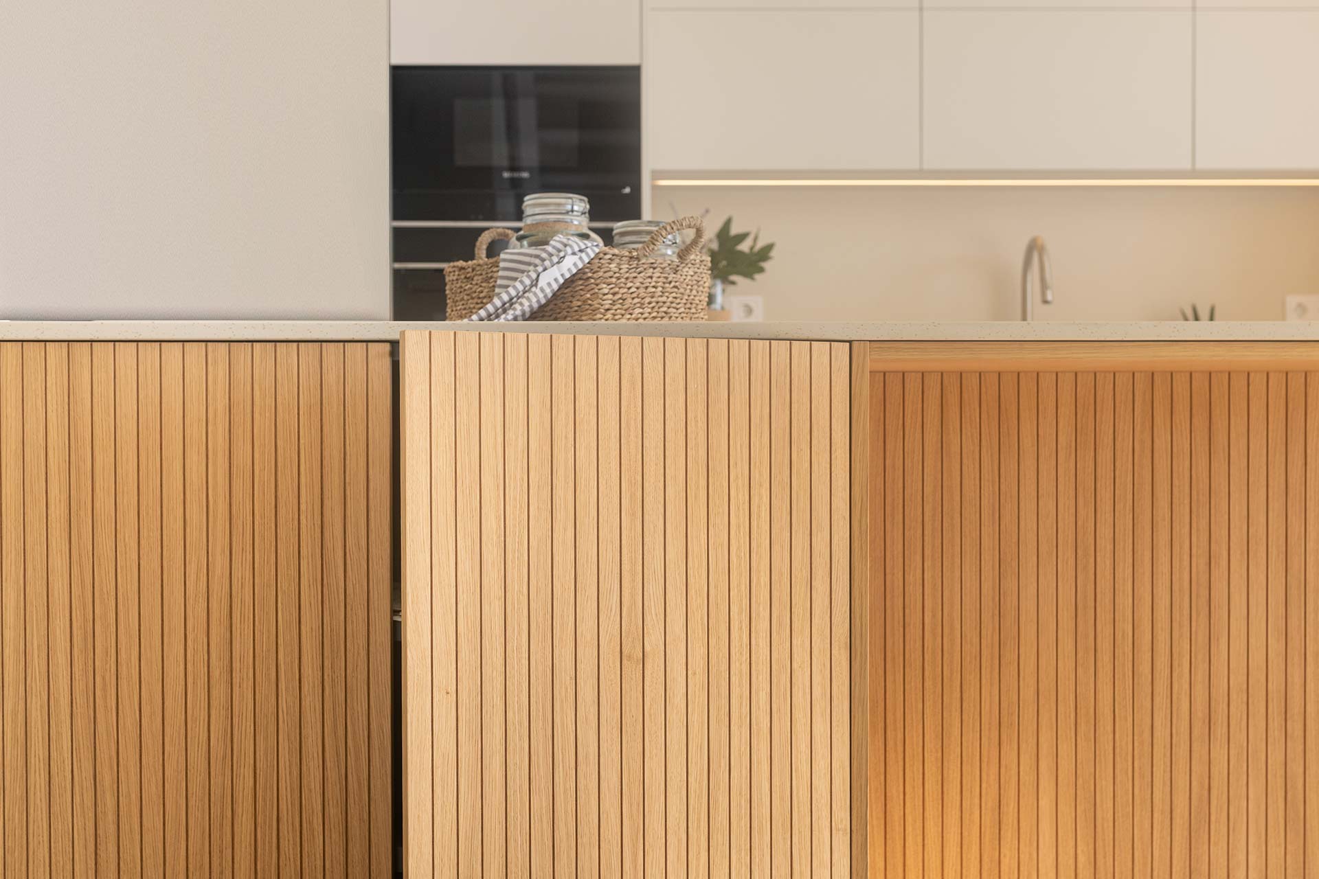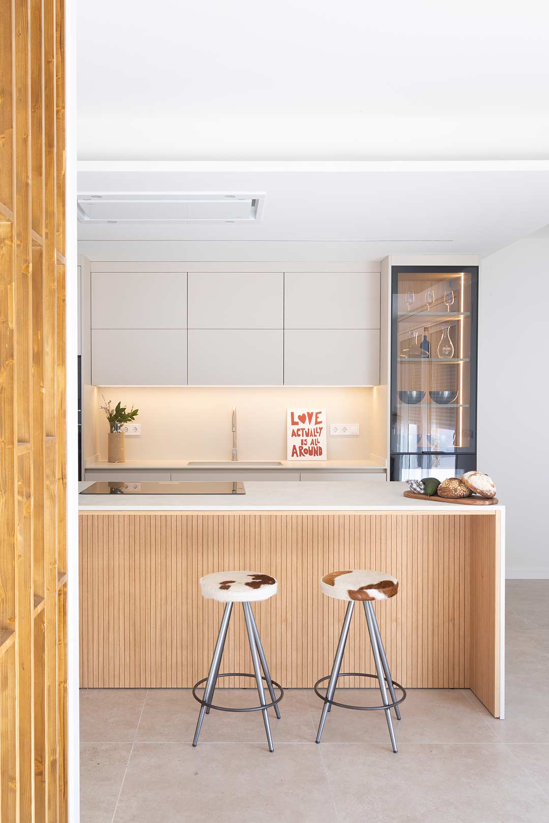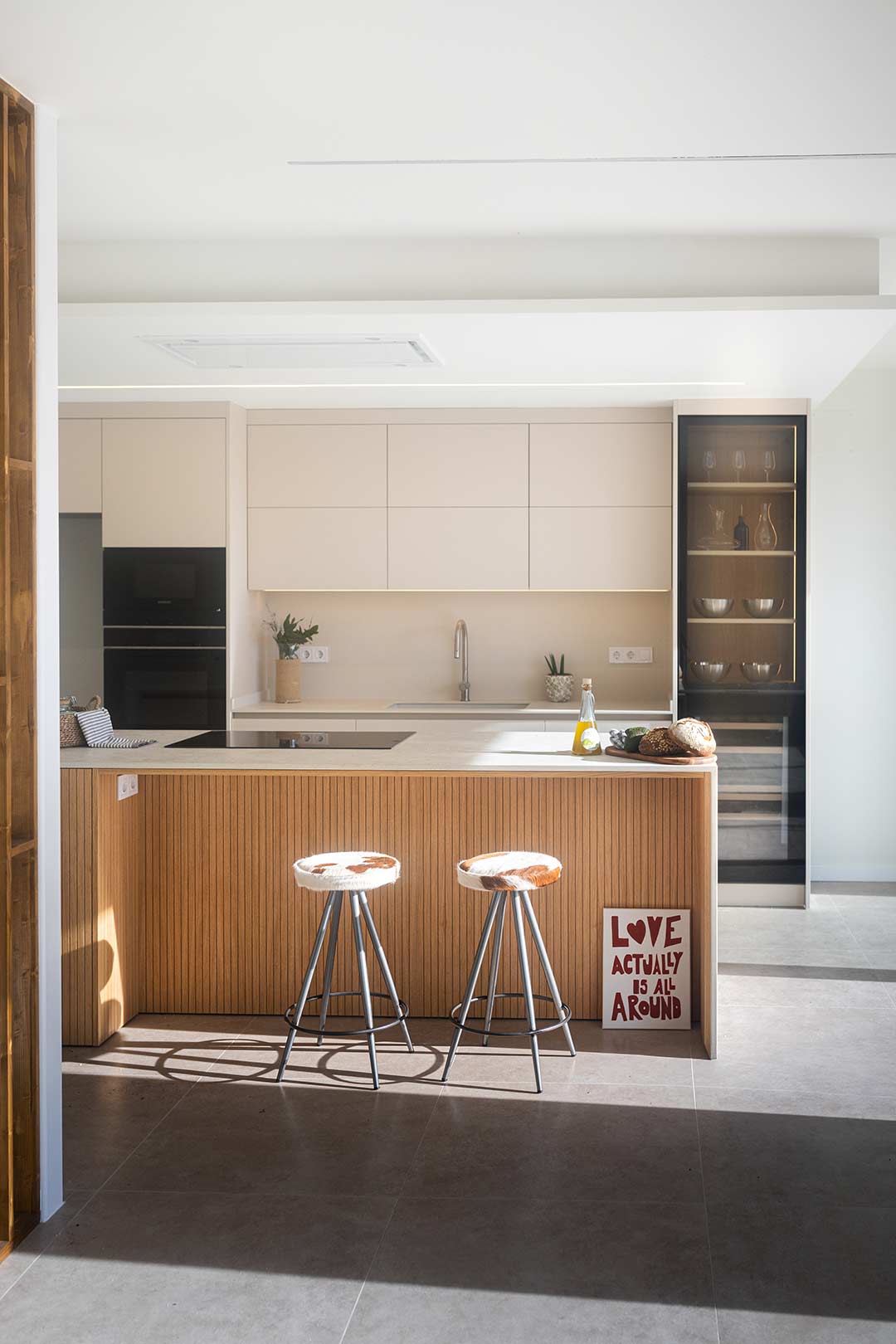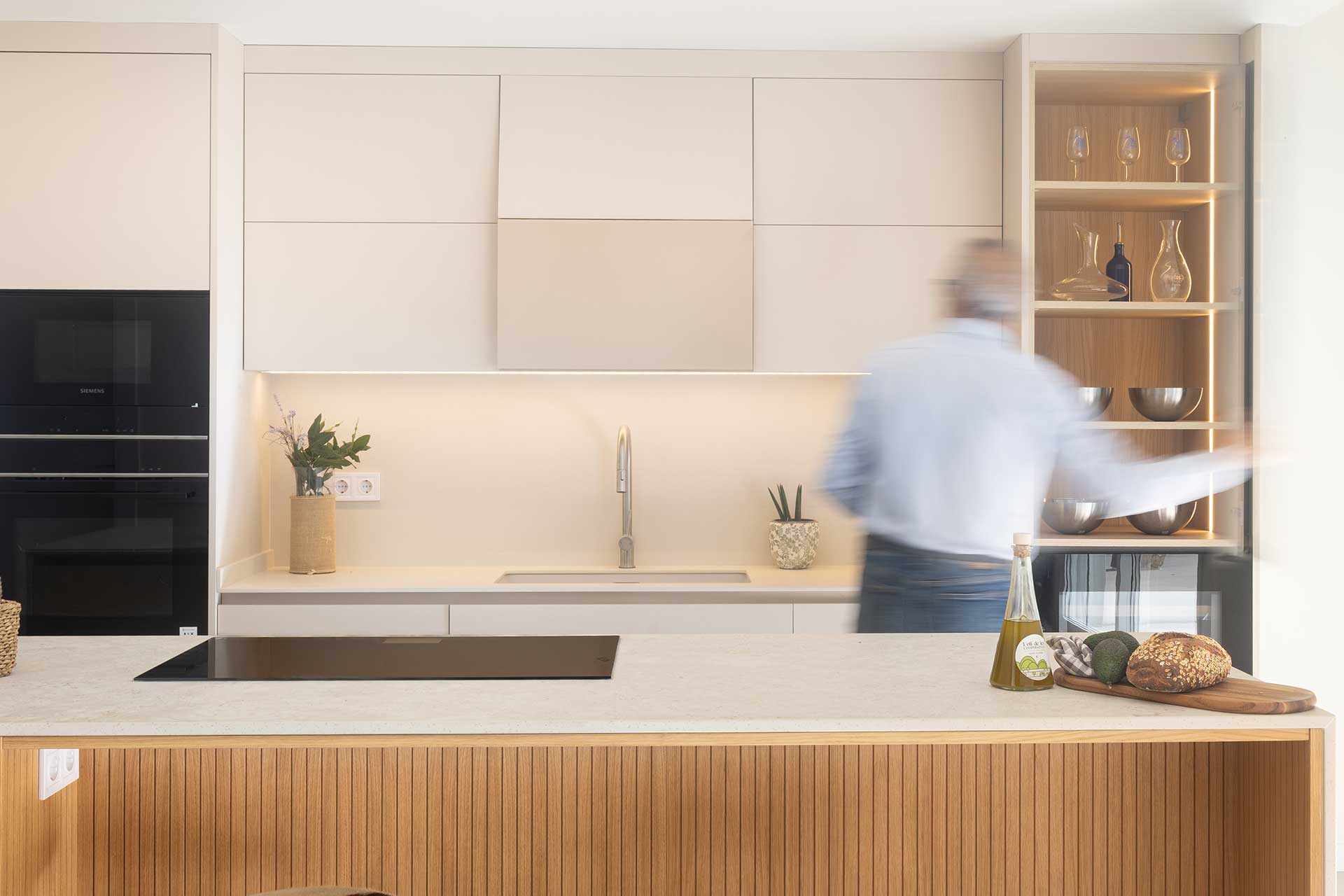 En este proyecto de cocina, el punto de partida fue un objetivo claro: integrar una vitrina y una vinoteca como ejes compositivos, construyendo un diseño donde estética y funcionalidad avanzan en equilibrio. Las vitrinas, hoy convertidas en piezas arquitectónicas clave—especialmente en cocinas abiertas al salón—aportan ligereza, profundidad e iluminación, además de funcionar como espacio de exposición para vajillas y piezas especiales. Aquí, el interior en madera aporta calidez y contrasta con la perfilería negra, mientras la iluminación LED vertical refuerza una atmósfera elegante que dialoga con la vinoteca. La gran isla central actúa como corazón social del espacio, con Dekton Sabbia en cascada como elemento casi escultórico, equilibrado por Dekton Aeris en la zona de fregadero; y la madera alistonada de roble, en puertas y trasera de isla, refuerza la integración con la zona de estar. El resultado es una cocina serena, cálida y atemporal, donde la vitrina no solo almacena: define la identidad del conjunto con luz, orden y carácter.
