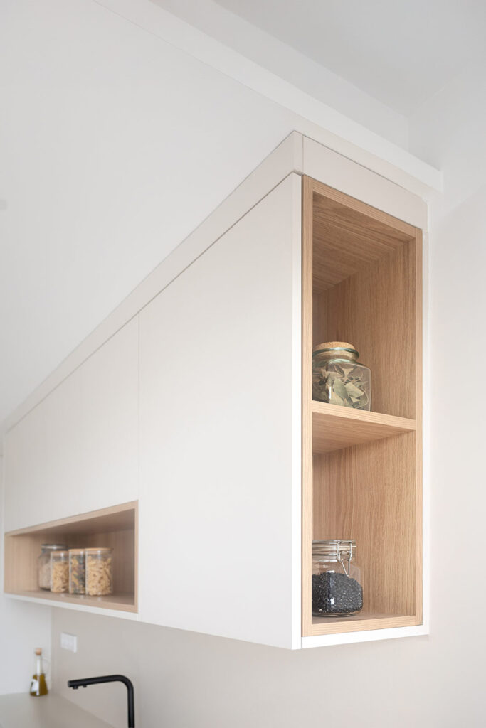 Los muebles decorativos abiertos en roble aportan dinamismo y visten la estancia desde dentro y desde fuera, creando continuidad visual y calidez.