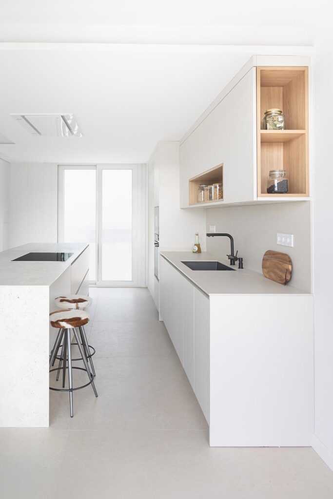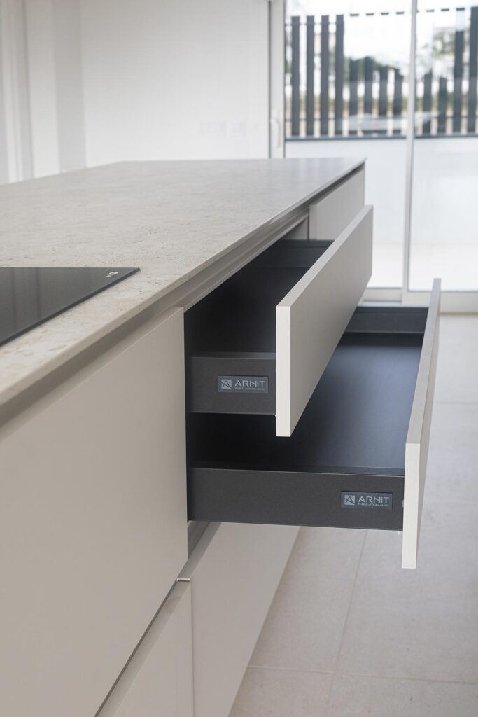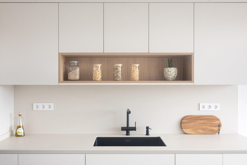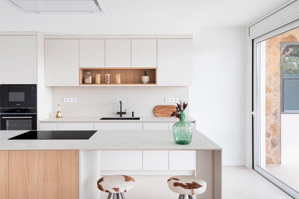 En esta cocina creamos un estilo limpio y sereno, sin tiradores, donde cada línea fluye con armonía. Los sistemas de apertura con golas y push aportan comodidad y una estética visualmente despejada, permitiendo que los materiales y las proporciones sean los verdaderos protagonistas.