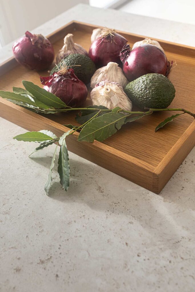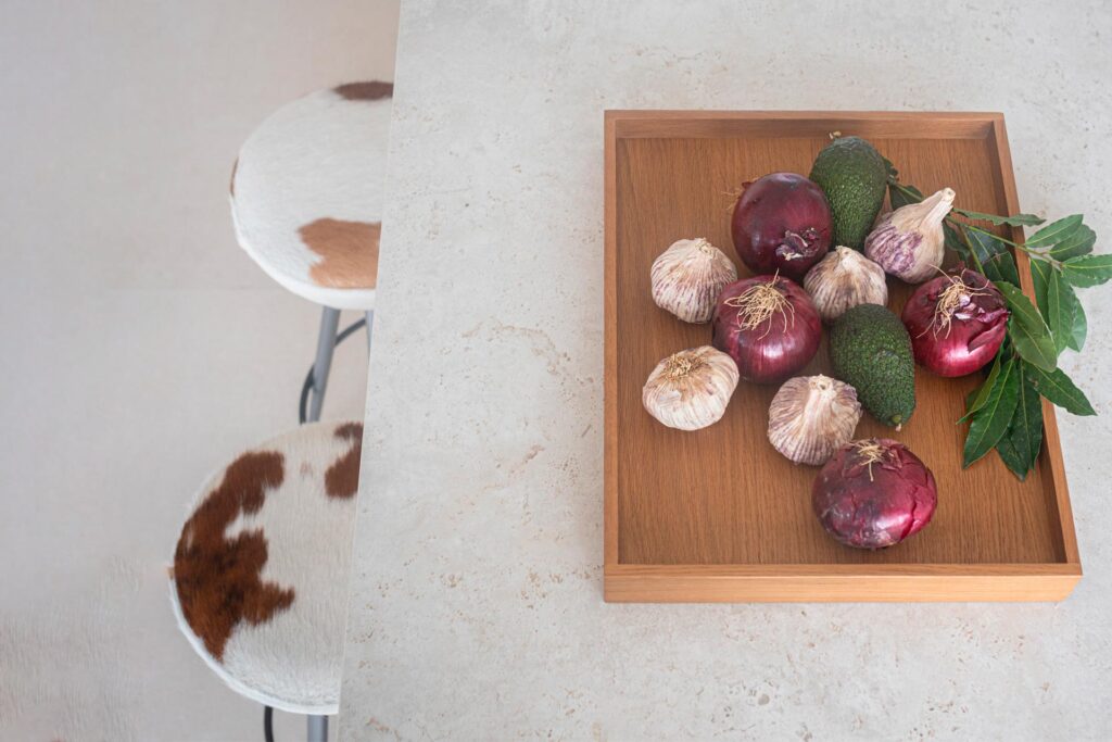 La encimera Dekton Sabbia en la isla, con su impresionante cascada hasta el suelo, aporta una presencia única y muy personal. Este modelo reinterpreta el puro travertino italiano, evocando la riqueza cromática y la textura de la piedra natural. Su belleza y resistencia incomparables aportan el carácter necesario para este ambiente natural y tranquilo, convirtiendo la isla en una pieza escultórica dentro del conjunto.