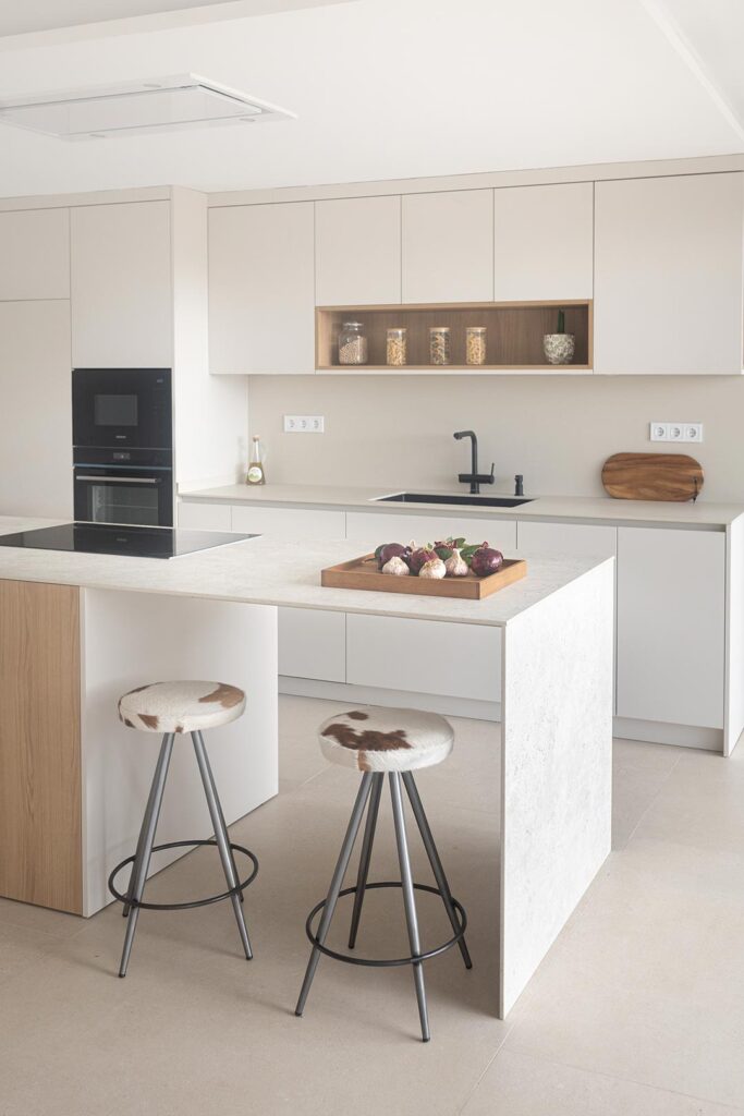 Los colores neutros son perfectos para cocinas que buscan calidez sin recurrir al blanco puro. Hoy, las tendencias evolucionan hacia blancos con matices más cálidos que, combinados con el roble, suavizan el estilo y envuelven el espacio en una atmósfera acogedora, natural y atemporal.