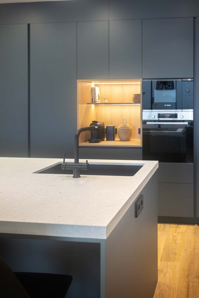 La encimera Dekton Polar se convierte en una de las grandes protagonistas. Su estética evoca la piedra caliza natural, con tonos pétreos y sutiles incrustaciones fósiles que aportan profundidad y autenticidad. Su grosor aporta carácter, fuerza y consistencia, y la textura realista de la piedra ilumina la cocina, destacando la isla como elemento central de la estancia.