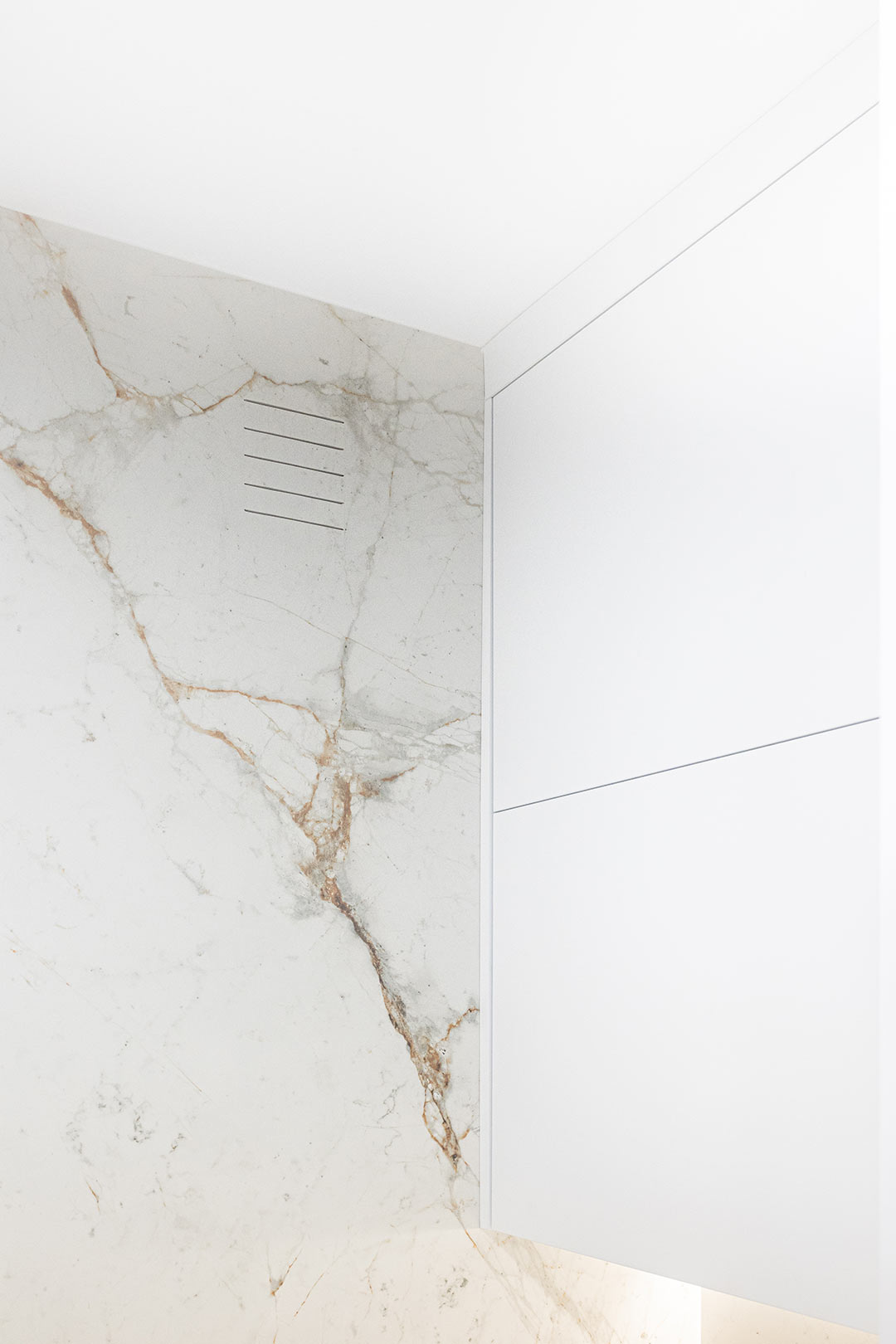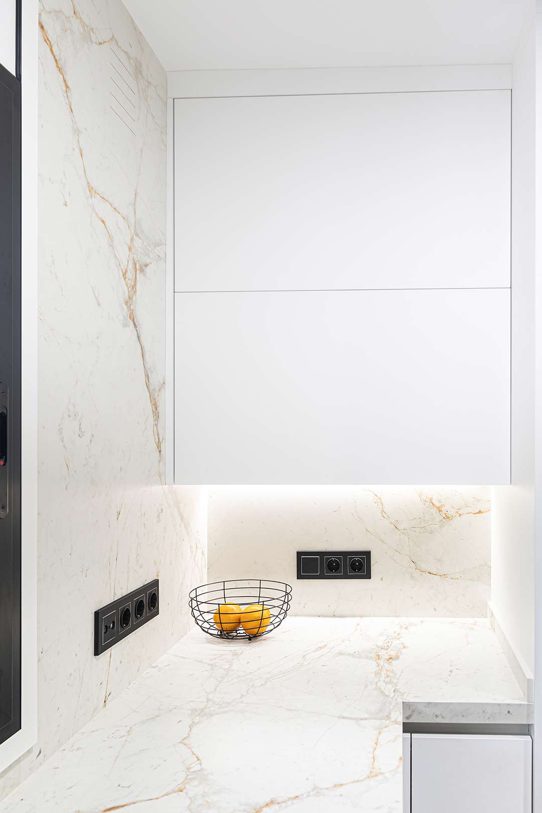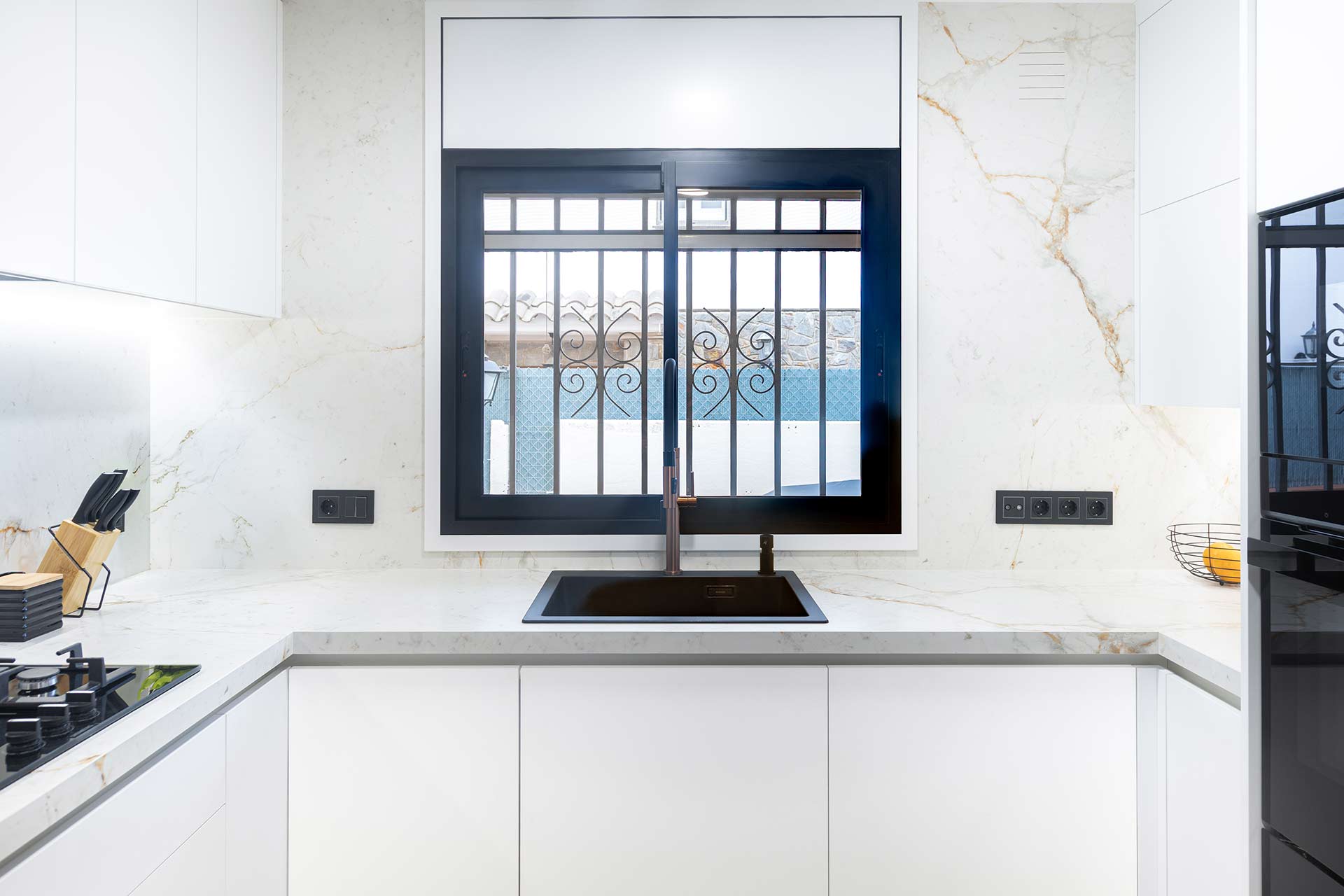 El blanco y negro construyen una base atemporal y equilibrada, mientras que la encimera en Neolith modelo Abu Dhabi aporta textura y profundidad, convirtiéndose en uno de los elementos protagonistas del espacio.