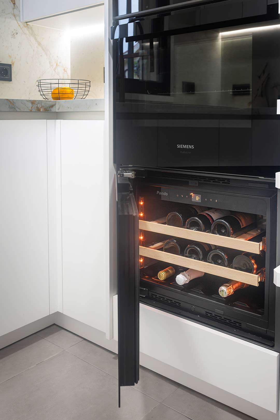 En la columna, el conjunto se completa con una vinoteca de Pando en la parte inferior, alineando los tres elementos para ganar en orden, comodidad y equilibrio visual.